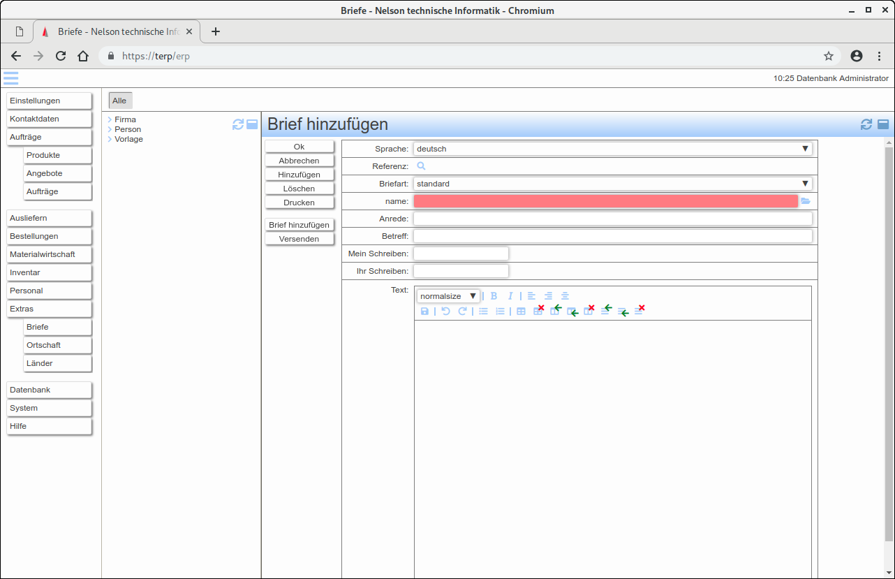 - Eingabebereich - Hier kann der Brief erstellt werden. Der Inhalt des Briefes wird mit dem Editor, der in Editor beschrieben ist, bearbeitet. Weiter gibt es folgende Werte: